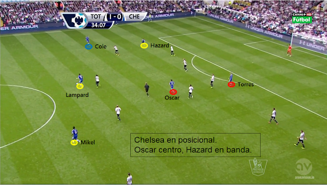 4) Al atacar de esta manera, los blancos cierran con 3 atrás: el lateral izquierdo Naughton centra su posición y acompaña a los dos centrales Vertonghen y Dawson. Tienen que aguantar las contras del Chelsea, que busca bien la transición rápida en largo hacia Torres bien conectar con Oscar en mediapunta.